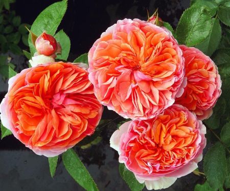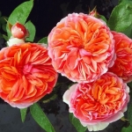 Сильнорослый шраб с темной блестящей листвой. Цветки насыщенно-оранжевые, очень душистые, густомахровые в старинном стиле. Очень обильное повторное цветение. Цветки очень хорошо стоят в срезке.