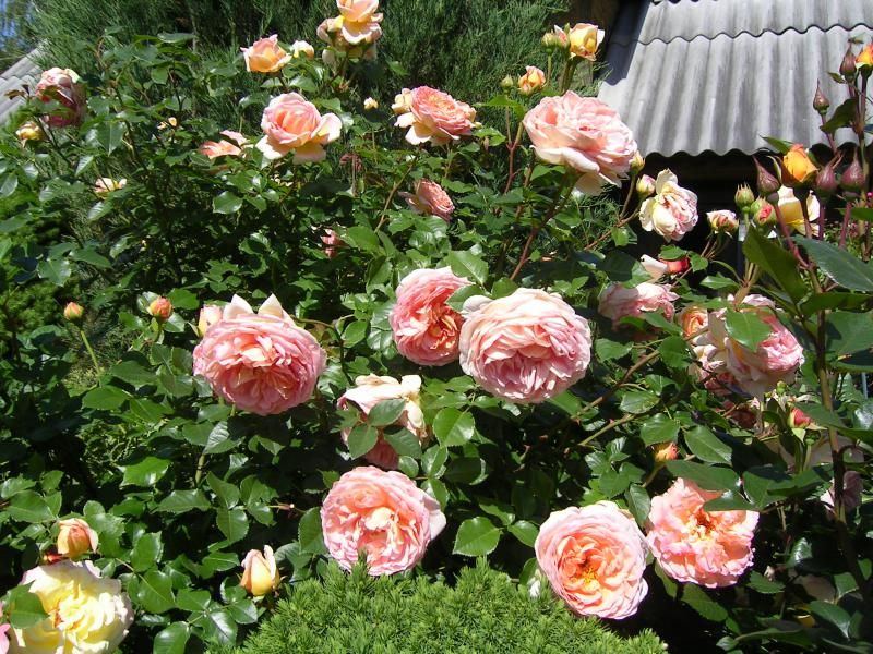 - Цветы розы Abraham Darby- розовые с абрикосовым тоном и жёлтые у основания лепестков;