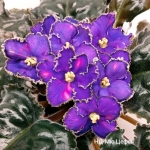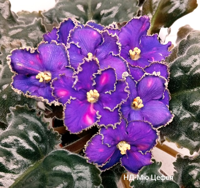 Крупные махровые сине-фиолетовые цветы, испещрены розовым фентези, по мере взросления цветка проявляется пурпурнокрасный ореол. Аккуратная, ровная розетка из зеленых изумрудных листьев. Шапочное цветение
