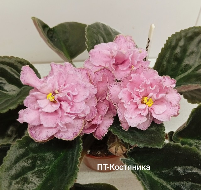 Крупные простые палево- розовые цветы Украшены осветлённой волнисто-гофрированной каймой и венозным рисунком насыщенно розово-малинового цвета. Розетка из волнистых листьев со слабо выраженной пестролистностью.