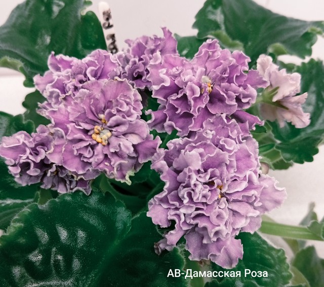 Крупные махровые белые звезды с сиренево-розовым фэнтези по гофрированной кайме лепестков. Аккуратная розетка, средне-зеленые слегка волнистые листья. Стандарт 2015
