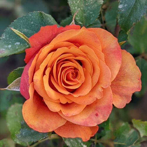 Цветы оранжево-алые, яркие, с тёмно-бархатным налетом, диаметр в роспуске 12-15 см., соцветия 2-5 шт., махровость 32 лепестка; сердцевина открытая, края лепестков округлые, волнистые; запах слабый. Листва густая, тёмно-зелёная, глянцевая. Шипы...