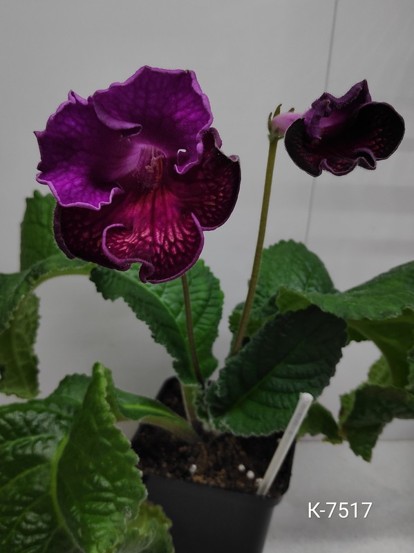 Крупные бархатистые сливового окраса цветки с более темными сетчатыми верхними лепестками, и с темно-желтыми полосками вперемешку со сливовыми точками и штрихами на нижних лепестках. Листья средне-зеленые. Стандартная компактная розетка.