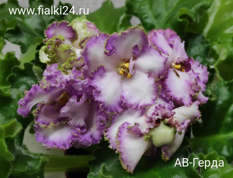 Крупные махровые белые звезды с сиренево-розовым фэнтези по гофрированной кайме лепестков. Аккуратная розетка, средне-зеленые слегка волнистые листья. Стандарт 2015
