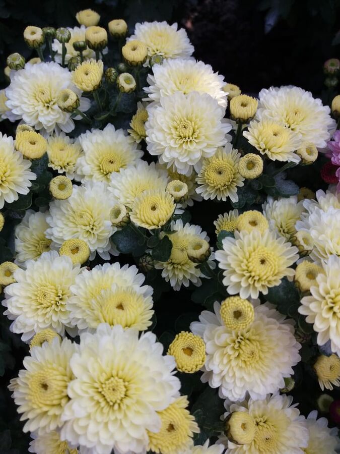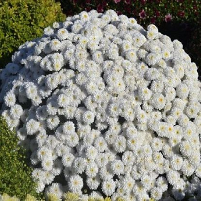 Куст пышный, шарообразный. Высота куста - 25 см. Цветы махровые молочно-белые с жёлтой серединкой. Диаметр цветка - до 3 см. Период цветения: август-сентябрь.